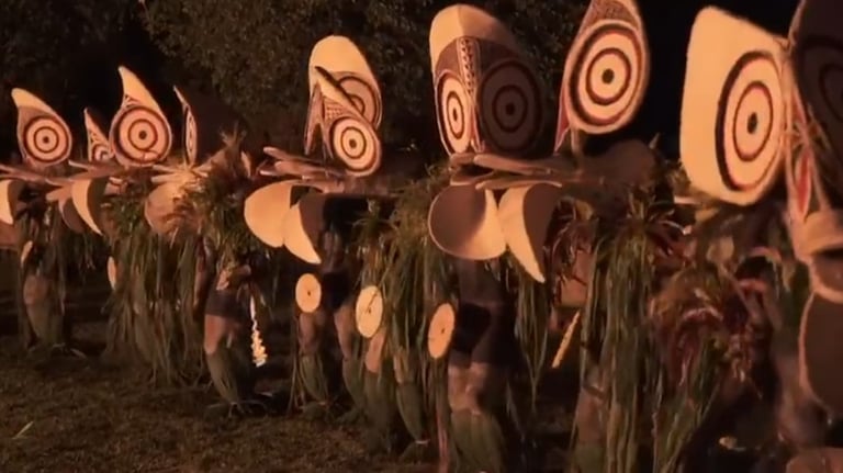 Watch Tolai warriors arrive in traditional war canoes.